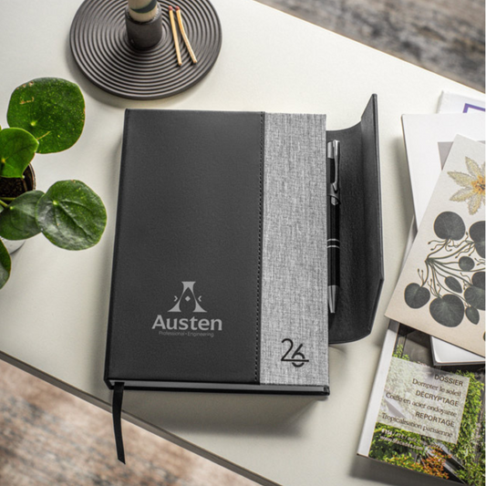 Agendas A5 sostenibles para empresas que cuidan el planeta. Diseño elegante, materiales reciclados y papel FSC™ para un merchandising ecológico y responsable.